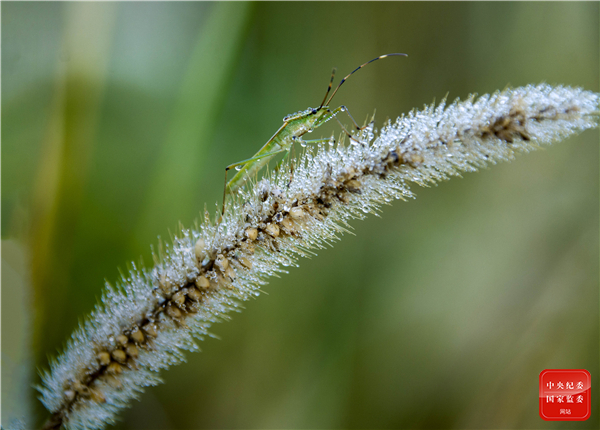 田野里,一只可爱的小蚂蚱披挂着晶莹剔透的露珠,闪耀在草露丛中,透着秋的清凉。(江西省上犹县纪委监委供 杨文国 摄)