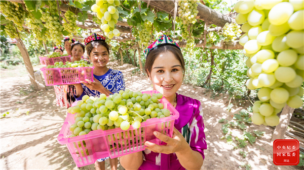 新疆维吾尔自治区库车市牙哈镇阿克布亚村的葡萄已经成熟,姑娘们正忙着采摘。(新疆维吾尔自治区库车市纪委监委供 袁欢欢 摄)