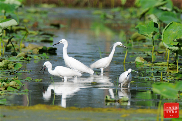 几只白鹭在微寒的荷花池内悠闲地觅食,享受美餐。(河南省郑州市管城区纪委监委供 胡立华 摄)