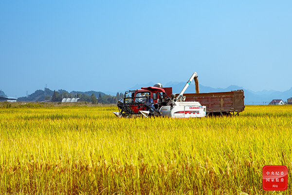 金黄稻田里,收割机来回穿梭,吞下丰稔的稻穗,吐出饱满的谷子。(杭州市纪委监委供 王晓晓 摄)