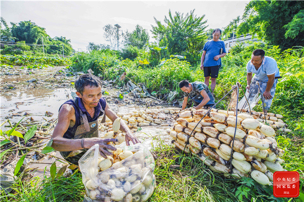 白露前后,正是挖藕吃藕的好时节,重庆市铜梁区土桥镇六赢村的莲藕喜获丰收。(重庆市铜梁区纪委监委供 张永红 摄)