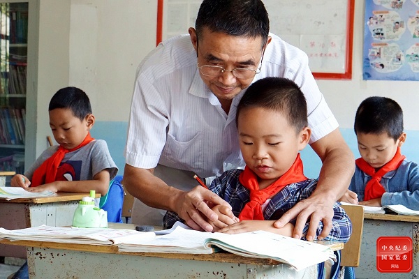 春蚕到死丝方尽。在安徽省宣城市泾县桃花潭镇菥荻村里藏着一个由一间教室、一位老师、三个孩子组成的“袖珍小学”。作为唯一的老师,许新民数十年如一日,守护着山区学生们的上学梦。图为许新民老师手把手教导孩子书写汉字。(安徽宣城市泾县纪委监委供 沈梦琴 摄)