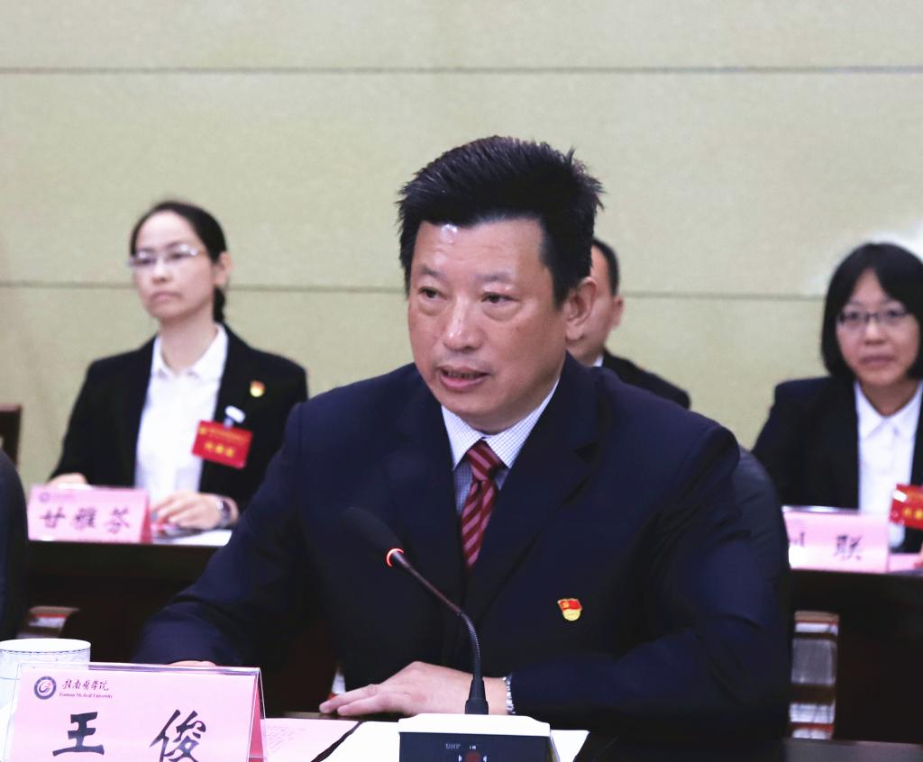 王俊受省委教育工委委派,向大会的召开表示热烈的祝贺。王俊指出,近年来,学校党委团结带领全体党员干部和师生员工,以打造德技双馨良才,办好人民满意的医科大学为目标,抢抓机遇,开拓创新,奋力作为,通过大力实施人才强校工程、质量提升工程、学科建设工程、科技创新工程、环境改善工程,学校的办学条件、设施和校园环境得到极大改善,科学发展、内涵发展、特色发展取得了长足进步,学校各项事业呈现蓬勃发展的良好态势。王俊希望学校党委聚焦学习贯彻习近平新时代中国特色社会主义思想,从更高层次贯彻落实习近平总书记视察江西重要讲话精神,确保“不忘初心,牢记使命”主题教育活动实效。围绕立德树人根本任务,不断提高医疗卫生人才培养质量。全面深入推进学校内涵建设,加快实现学校办学层次的提升。主动对接地方需求,努力为我省经济社会发展作出新贡献。