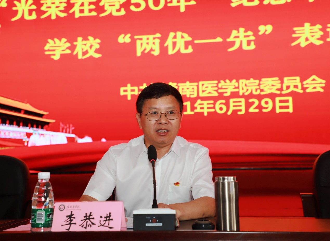 李恭进指出,今天受表彰的同志,既有为学校发展夯实基础、无私奉献的老党员,又有为学校发展提速锐意进取、奋勇争先的新同志;既有白衣执甲、逆行出征的一线医务人员,又有潜心教学、勇于创新的教学科研人员,还有不少辛勤付出、默默奉献的管理人员,大家都在各自岗位上书写着不平凡的故事,用纯粹的信仰和坚定的行动诠释着共产党人为人民谋幸福的初心,践行着为民族谋复兴的使命。学校各级党组织和全体党员都牢记党的宗旨和历史使命,弘扬“艰苦奋斗,科学求是”的办学传统,立足本职岗位,朝着创建一流医科大学的宏伟目标,齐心协力推进更名大学各项任务落地落实,在造就德技双馨的良才,办好人民满意的医科大学中发挥了不可替代的积极作用。