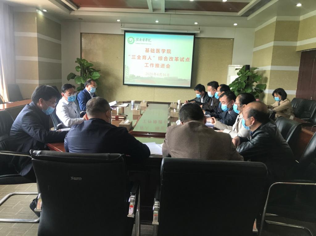 4月16日下午,基础医学院在黄金校区举行“三全育人”综合改革试点工作推进会,学校党委副书记曾泽鑫、党委委员、副校长叶军明,党委委员、宣传部长廖志平到会指导。基础医学院领导班子和部分工作人员参加会议。