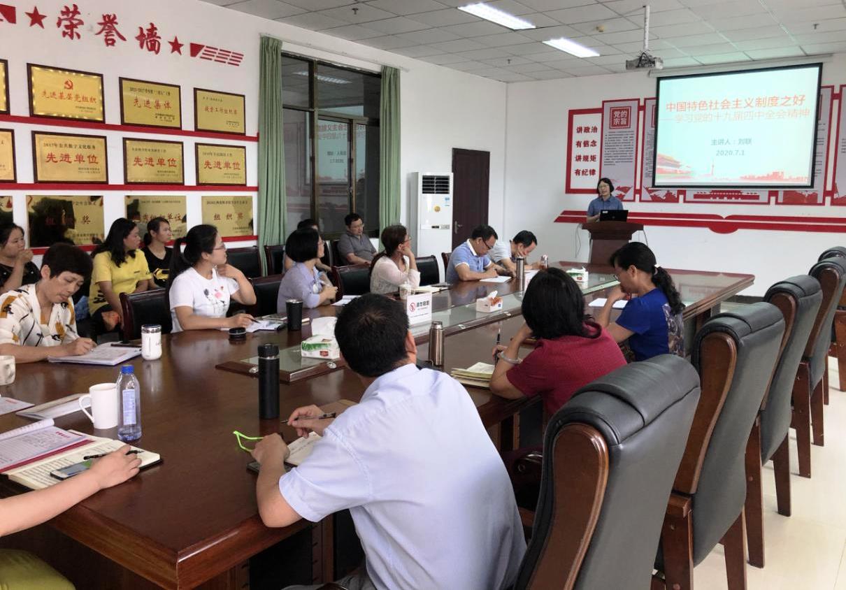 图书馆党总支书记刘联以《中国特色社会主义制度之好——学习党的十九届四中全会精神》为题,重点阐述了中国特色社会主义制度的独特创造性、巨大优越性、与时俱进不断完善和发展的三大特点,带领大家科学认识了中国特色社会主义制度内容、形成过程、评判标准及强大优势。
