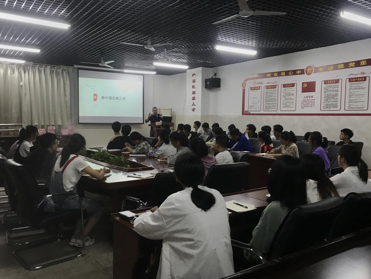 陈建文通过介绍中国廉政文化的涵义、发展以及反面事例,带领大家回顾了中国共产党的初心和使命,并组织大家共同学习了《中国共产党廉洁自律准则》《中国共产党纪律处分条例》,强调每个党员都要托起“公平秤”,做到清正廉洁,勉励同学们要在遵守“三个文明”、传承“红医精神”方面发挥示范作用。